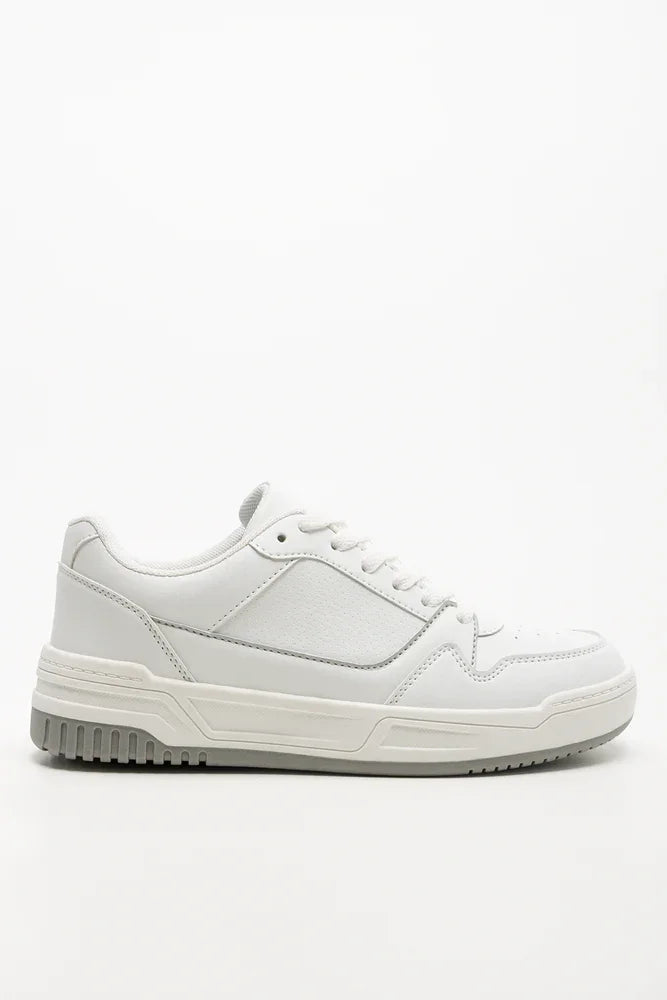 Dominate the court in style with our basketball high-top shoe. Predominantly white with grey accents...